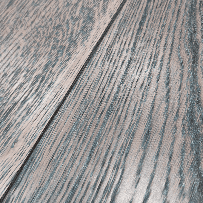 На эскизе: Брашировка (от английского слова brush «Щётка», «вычесанные» мягкие волокна древесины глубиной 0,3-2 мм для снятия напряжения, создания эффекта состаривания и визуального выделения патины) средней глубины (до 1 мм). Основной оттенок тройной синевато-бежевый, простой бежевый переходящий очень светлый бежевый. Двойная пигментация патины, большая часть патины (80-90%) темная серо-черная, вторая пигментация молочная. Степень Gloss (глянец) 40% - полуматовый.